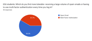 When students were asked which they’d rather deal with, the majority of students (58.3%, or 21 people) indicated they would prefer to just keep dealing with spam emails rather than use MFA, while a significant portion (41.7%, or 15 people) found MFA more tolerable.