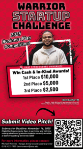 EAST STROUDSBURG, Pa. – East Stroudsburg University’s Entrepreneurial Leadership Center (ELC) is calling on all student innovators to take the first step toward launching their business ideas. Round 1 of the 2025–2026 Warrior Startup Challenge is officially underway, with video submissions due by midnight on Sunday, November 16, 2025.