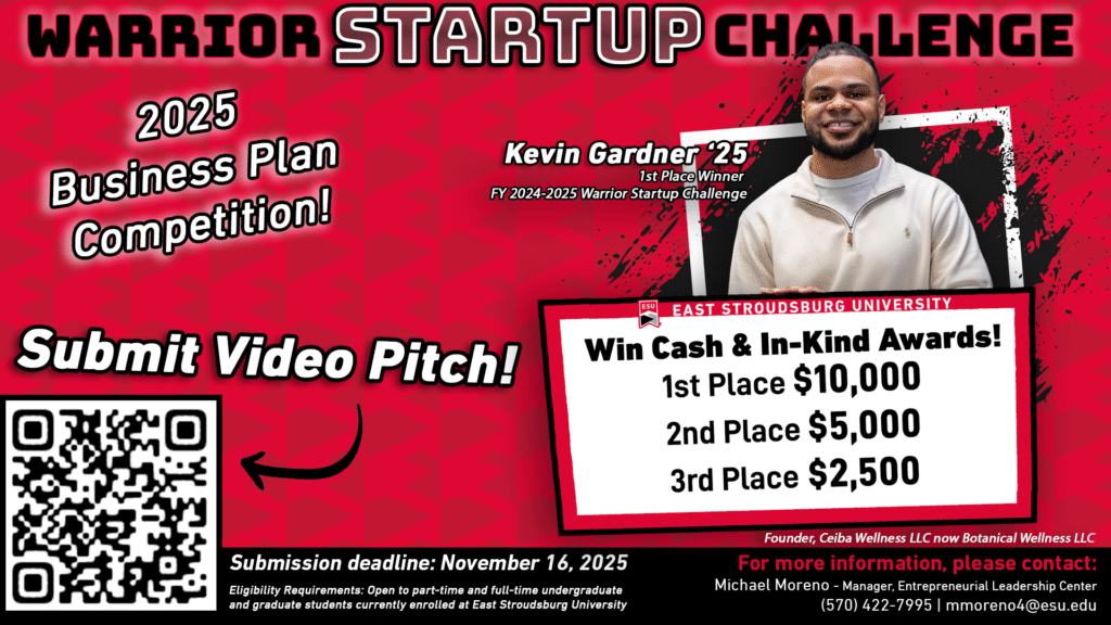 EAST STROUDSBURG, Pa. – East Stroudsburg University’s Entrepreneurial Leadership Center (ELC) is calling on all student innovators to take the first step toward launching their business ideas. Round 1 of the 2025–2026 Warrior Startup Challenge is officially underway, with video submissions due by midnight on Sunday, November 16, 2025.